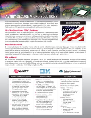 Avnet Electronics Marketing, IBM, and Endicott Interconnect (EI) collaborate to provide advanced electronic solutions for the defense aerospace industry, emphasizing Size, Weight, and Power (SWAP) reductions through System-in-Package (SiP) technology. EI's CoreEZ semiconductor package and IBM's ASIC design systems enhance the performance and reliability of military electronics while maintaining compliance with industry standards. The partnership enables rapid product development and a robust supply chain, supporting the evolving needs of customers in high-performance electronic packaging.