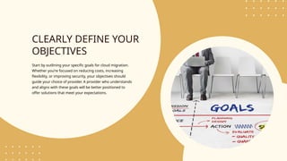The document outlines key considerations for choosing a cloud migration service provider, emphasizing the importance of clearly defining objectives, assessing provider experience, and ensuring a detailed migration plan. It highlights the necessity of post-migration support, evaluating cost implications, prioritizing security and compliance, and assessing cultural fit for effective communication. These factors contribute to a successful migration experience while ensuring alignment with business goals.