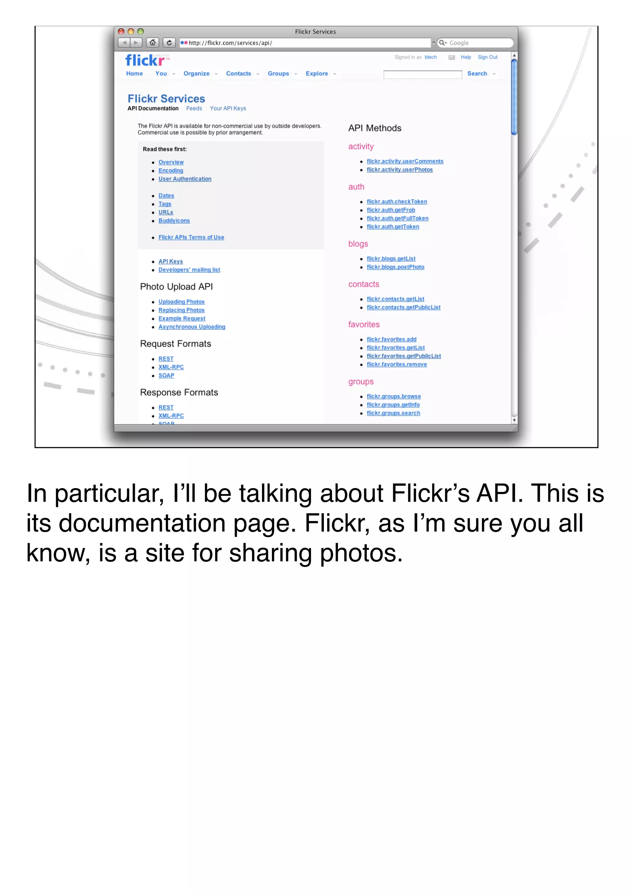 Paul Mison discusses the challenges of using the Flickr API with Ruby, highlighting the issues with existing libraries and the risks of abandonment due to boilerplate code. He suggests focusing on dynamic methods to handle API calls efficiently and advocates for using JSON response formats instead of XML for easier data handling. The presentation emphasizes the importance of creating simple access wrappers and avoiding complex abstractions when working with APIs.