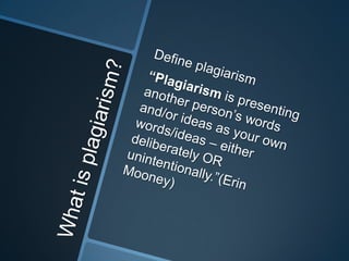 The document discusses avoiding plagiarism by properly citing direct quotes and paraphrasing others' work instead of copying verbatim. It provides examples to distinguish between plagiarism and acceptable paraphrasing, noting that paraphrasing involves putting ideas in your own words without copying sentence structure while changing more than a few words constitutes plagiarism. The examples demonstrate how to properly paraphrase others' work while avoiding plagiarism.