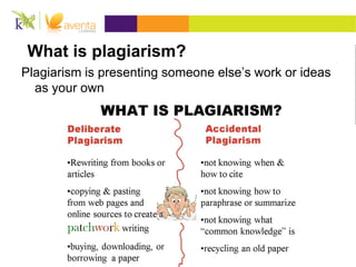 The document discusses plagiarism and how to avoid it. Plagiarism is presenting someone else's work as your own without giving them credit. It is considered stealing, lying, and a violation of copyright laws. To avoid plagiarism, you should not copy and paste from websites or retype sources without citation. Instead, you should paraphrase sources in your own words and attribute the information. When directly quoting sources, use quotation marks and provide citations. The document also provides examples of proper paraphrasing and using citations.