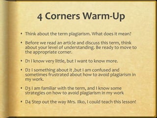 This document outlines a lesson plan for teaching students about plagiarism. It includes activities where students consider what plagiarism means, read definitions and articles about it, and learn strategies for taking notes, quoting, paraphrasing and summarizing sources. Students practice these skills by analyzing passages and writing their own summaries, quotes and paraphrases. The goal is for students to understand what plagiarism is and how to properly cite sources in their own writing to avoid it.