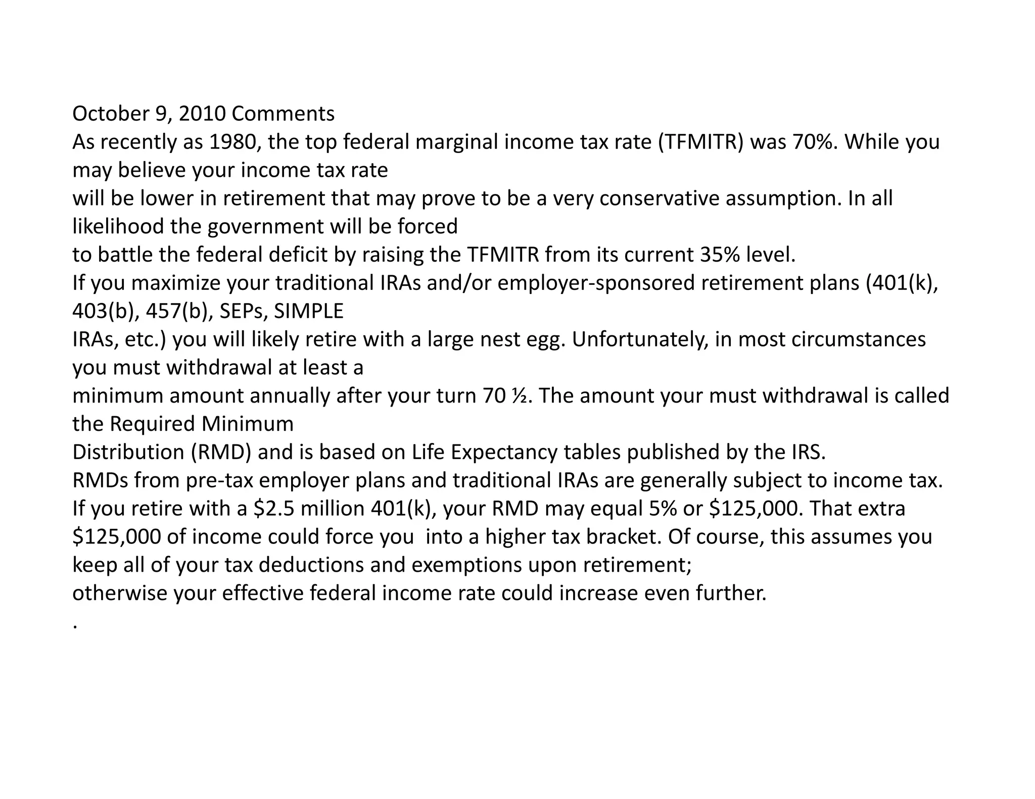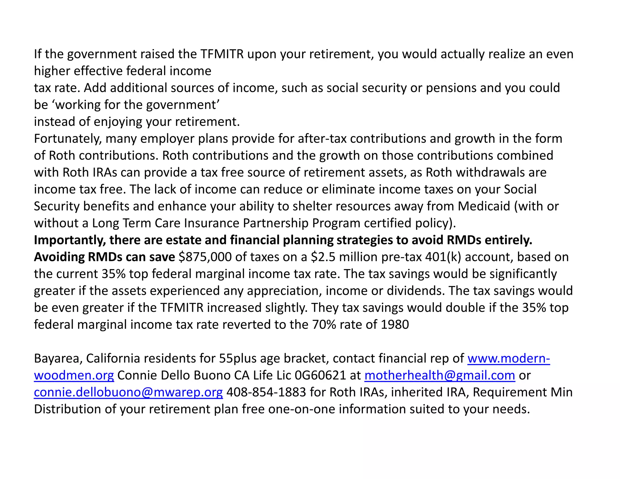 The document discusses the potential impact of federal tax rate changes on retirement income, highlighting the possibility of higher tax liabilities due to required minimum distributions (RMDs) from traditional retirement accounts. It emphasizes the benefits of Roth contributions and strategies to avoid RMDs, which could lead to significant tax savings. Additionally, it suggests consulting a financial representative for personalized advice regarding retirement planning and available options.