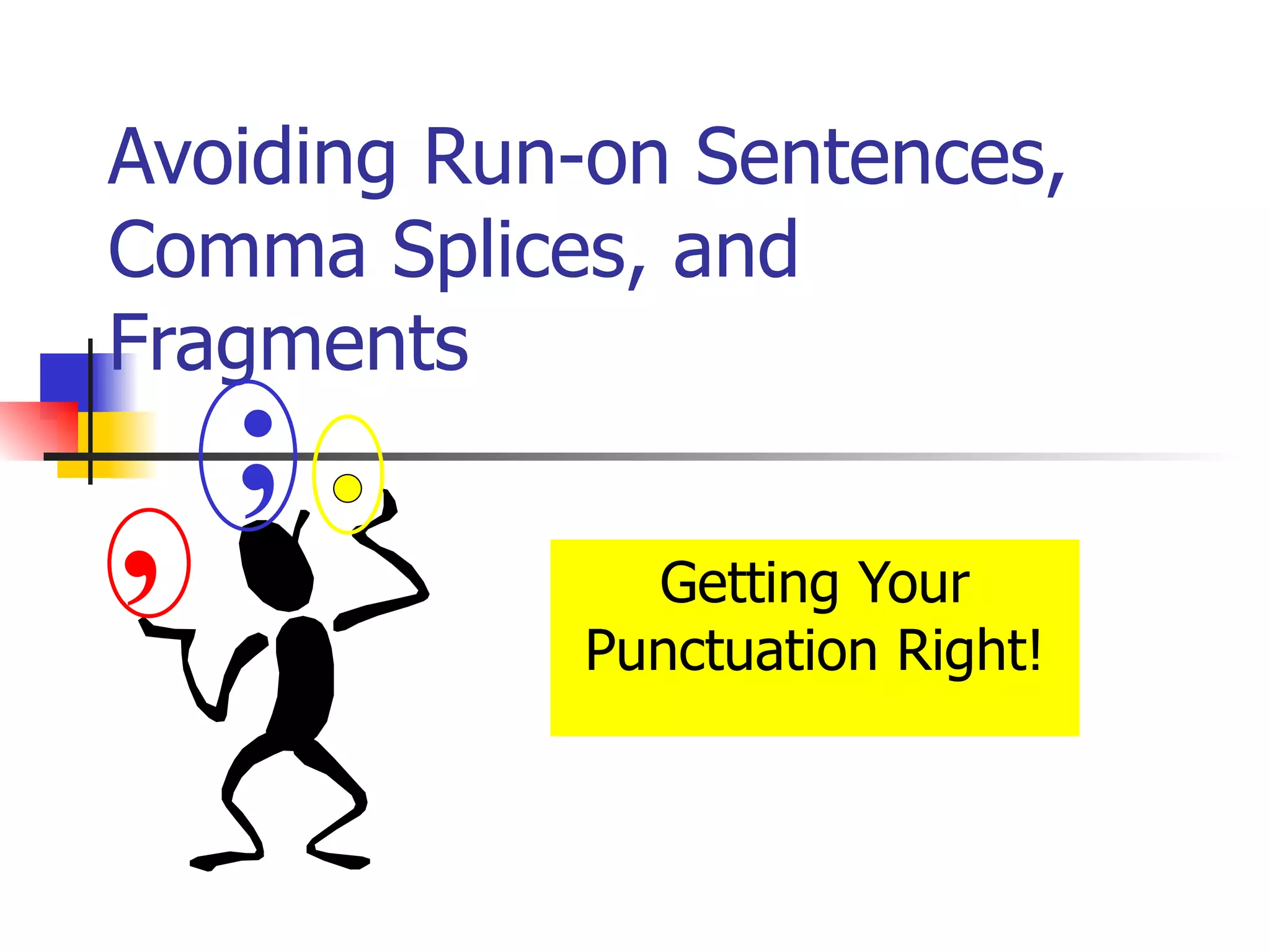 This document provides information on avoiding common punctuation errors such as run-on sentences, comma splices, and fragments. It explains what commas, periods, and semicolons signify and how to correct sentence structure issues. Specifically, it outlines five ways to correct run-ons and comma splices: using a period, semicolon, semicolon with a transitional word, comma with a FANBOYS conjunction, or joining sentences with a subordinating conjunction/relative pronoun. The document emphasizes practicing examples to determine the proper punctuation.