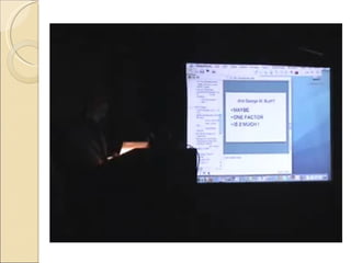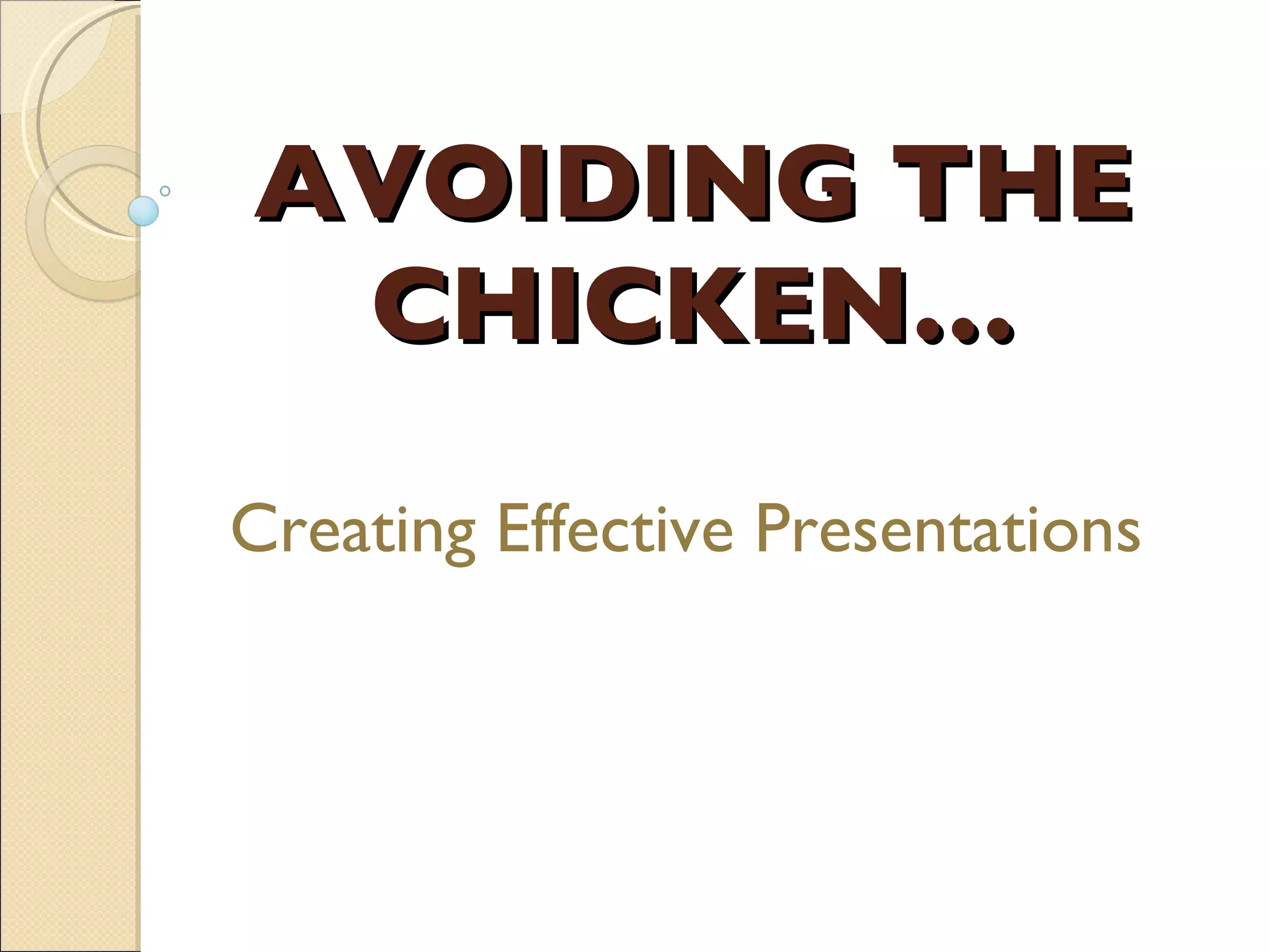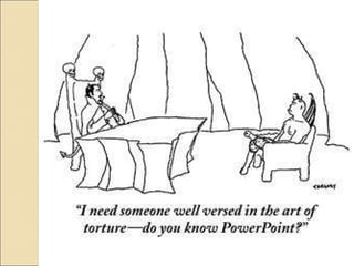 The document discusses tips for creating effective presentations. It recommends using a sans-serif font in size 28 or higher, a light background with dark text, and no more than 5 bullet points per slide. It advises against putting full paragraphs of text on slides or reading slides verbatim, as this prevents the audience from listening. The document also suggests using images, video, humor and personal stories to engage audiences rather than just decorating slides.
