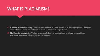 This document provides a guide to avoiding plagiarism and maintaining academic integrity. It defines plagiarism as using another's work without proper citation or attribution. The document outlines signs of plagiarism, such as abrupt changes in writing style or including information without citing the source. It recommends conducting thorough research, taking detailed notes, and properly documenting all sources used. Maintaining a research log with full citations and quotes can help prevent accidental plagiarism. The document stresses the importance of citing sources through in-text citations or footnotes any time another's ideas or words are used.