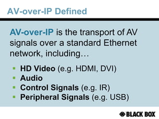 The document discusses AV-over-IP, which transports AV signals such as video, audio, and control signals over Ethernet networks. It can eliminate port limits and distance limitations by distributing content from a single source to hundreds of displays anywhere the network reaches. AV-over-IP provides benefits like flexibility, scalability, image quality, cost savings, and the ability to use existing networking equipment. The document provides examples of AV-over-IP applications and compares it to HDBaseT, and also describes Black Box's AV-over-IP solutions.