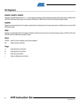The document provides information about the instruction set nomenclature, registers, operands, status register flags, program and data addressing modes, and the complete instruction set of the AVR microcontroller architecture. It defines the purpose and bit mappings of registers like SREG, RAMPX, RAMPY, RAMPZ, and EIND. It also describes the various addressing modes for accessing program memory and data memory, including register direct, I/O direct, data direct, indirect with/without displacement, and indirect with pre/post-increment. The complete instruction set summary provides the mnemonics, operands, description, operation on flags and clock cycles for arithmetic, logic, branch, and other instructions.