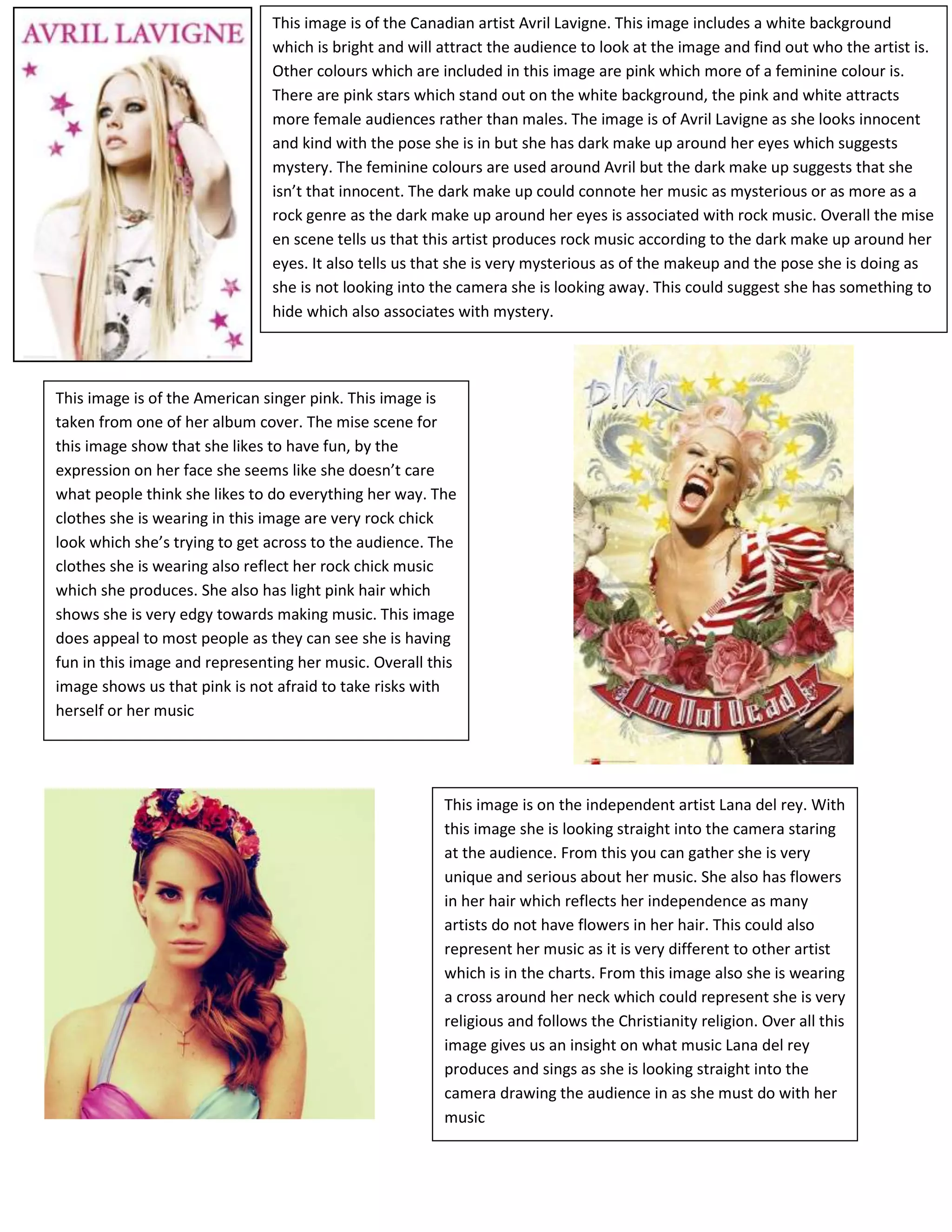 This image shows the Canadian artist Avril Lavigne. She has a feminine look with pink stars on a white background, yet also suggests mystery with dark makeup around her eyes. The dark makeup hints at her rock music genre. Overall, the image conveys that Avril Lavigne produces rock music and has a mysterious side.
