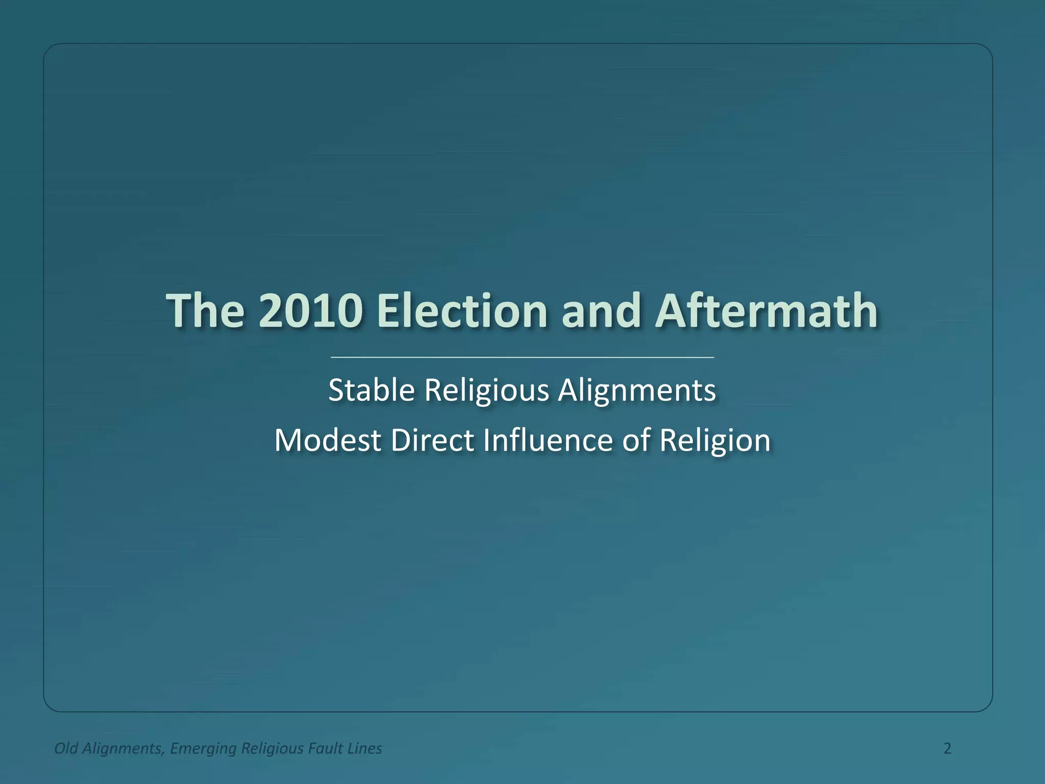 The document analyzes the influence of religion on the 2010 U.S. elections and outlines the emerging religious fault lines and stable religious alignments among voters. It addresses key issues like the economy and health care, the role of faith in voting behavior, and attitudes towards President Obama's religious beliefs. It also highlights different priorities among voters for both Democratic and Republican parties, and tensions within the GOP coalition regarding discrimination and foreign policy attitudes.