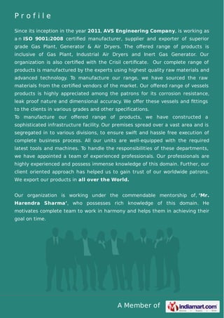 AVS Engineering Co. is an ISO 9001:2008 certified manufacturer and exporter of gas plants, generators, air dryers, and other industrial equipment based in Vadodara, India that was established in 2011. The company has a large production facility with over 11-25 employees and experienced R&D department that allows it to manufacture high-quality products using advanced technology. AVS Engineering Co. exports its wide range of industrial equipment worldwide and is led by director Mr. Harendra Sharma.