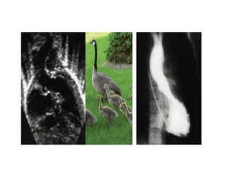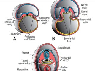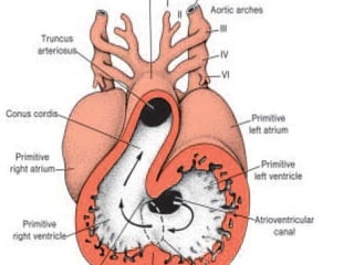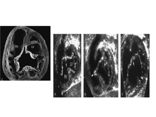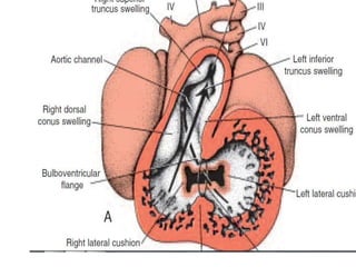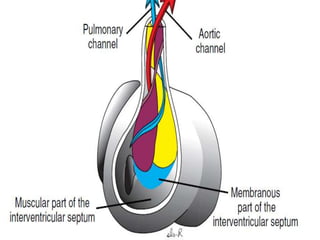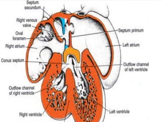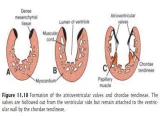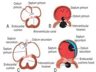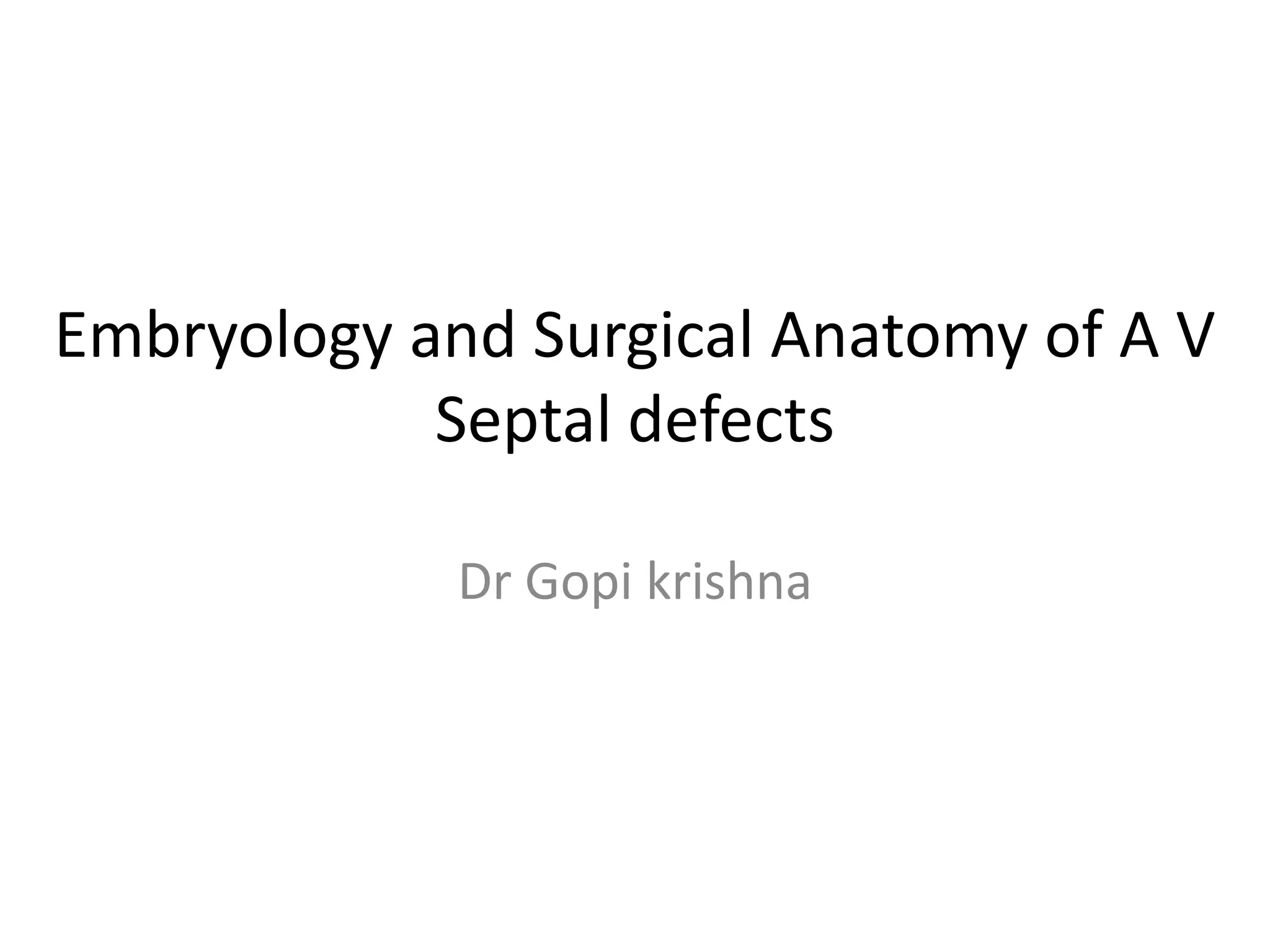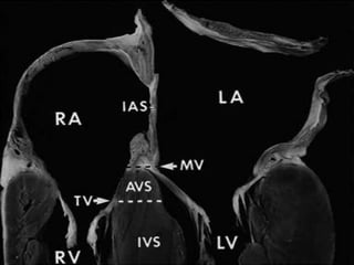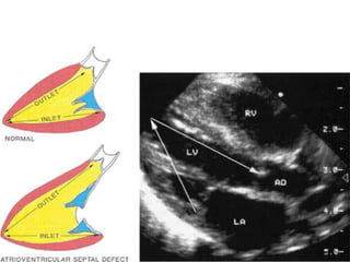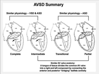 This document discusses the embryology, anatomy, classifications, and associated anomalies of atrioventricular septal defects (AVSDs). It describes the embryologic development of endocardial cushions and septum that can lead to partial or complete AVSD. Partial AVSD involves a cleft in the anterior mitral valve leaflet while complete AVSD lacks fusion of endocardial cushions, forming a common atrioventricular valve. Complete AVSD is further classified and associated anomalies are discussed, including conotruncal defects, coronary anomalies, and ventricular disproportion. Valve abnormalities like double orifice, papillary muscle anomalies, and their implications are also summarized.
