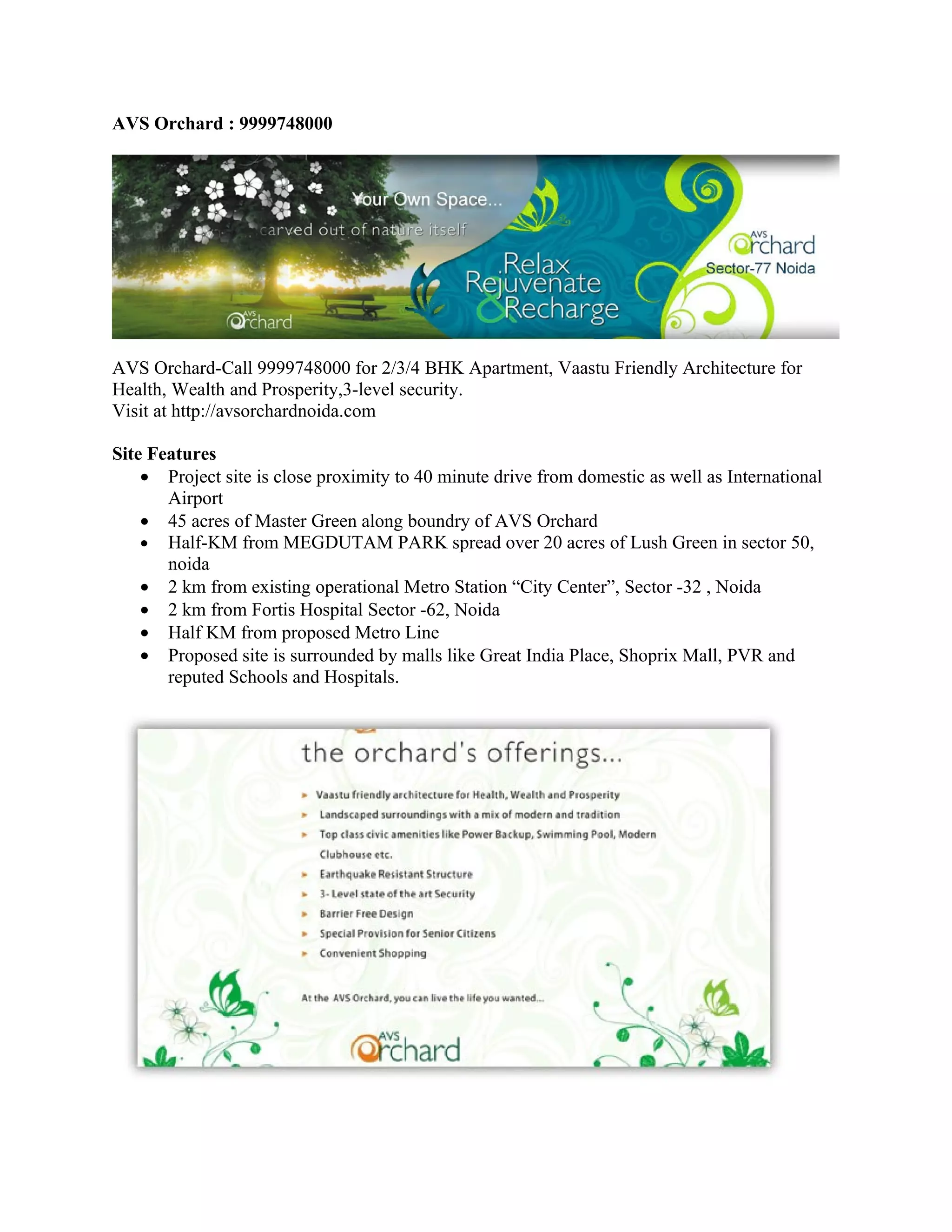 AVS Orchard is a residential project located in Noida offering 2/3/4 BHK apartments with features like Vaastu architecture, landscaped surroundings, civic amenities like a swimming pool and clubhouse, earthquake resistant structures, 3-level security, and convenient shopping nearby. The project site is close to the airport and key locations like hospitals, metro stations and malls. It has amenities like multiple orchards, a playground, jogging tracks and more. Interested customers can call 9999748000 or visit the website for more details.