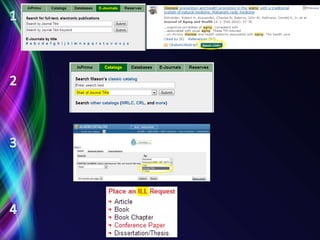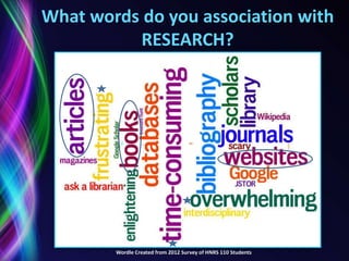 This document provides an overview of the research process for an art and design studio fundamentals course at George Mason University. It discusses the typical words associated with research, highlights different approaches to research across disciplines, and outlines the key steps in the research process including determining search terms, identifying appropriate databases and journals, conducting searches, and evaluating and incorporating sources. The document also provides tips and examples for searching databases and obtaining full-text articles and other research materials.