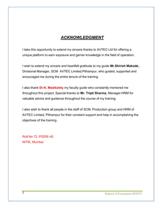 The document summarizes a study conducted at AVTEC Ltd from April 2011 to June 2011 for partial fulfillment of an MBA degree. It identifies 10 key processes within AVTEC's Supply Chain Management Group (SCMG) including the overall SCMG process, capacity mapping, supplier selection, purchase order release, and cost savings processes. It also maps the documentation flows within these processes and identifies various documents used like the APQP template, supplier pre-qualification form, and RFQ. The study aimed to understand AVTEC's corporate culture, organization structures, documentation flows, and interactions between departments.