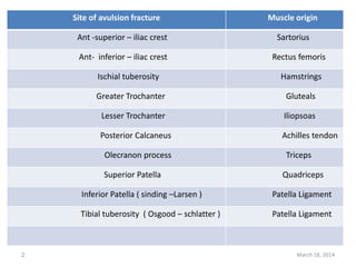 The document lists 10 common sites of avulsion fractures caused by the tearing away of tendons or ligaments from bone. It identifies the specific muscles or tendons that can cause avulsion fractures at the iliac crest, ischial tuberosity, greater trochanter, lesser trochanter, posterior calcaneus, olecranon process, superior patella, inferior patella, and tibial tuberosity.
