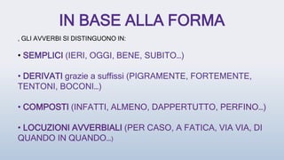 Il documento analizza la funzione e la classificazione degli avverbi in base alla loro forma e significato. Gli avverbi possono essere semplici, derivati, composti o locuzioni avverbiali, e si distinguono in positivo, comparativo e superlativo. Viene anche trattato l'uso dei suffissi per modificare il significato, come diminutivi e accrescitivi.