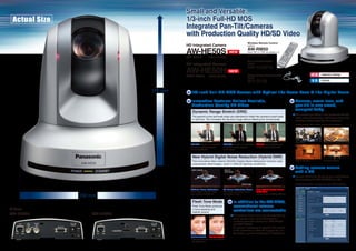This document provides specifications for the AW-HE50 integrated camera. It has a 1/3" Full-HD MOS imaging sensor and a motorized 18x zoom lens. Video output options include HD/SD-SDI and HDMI, and it has an IP network interface for remote control. Key features are 1080p video capture, 18x optical zoom, auto and manual focus, and remote operation via IP networks.