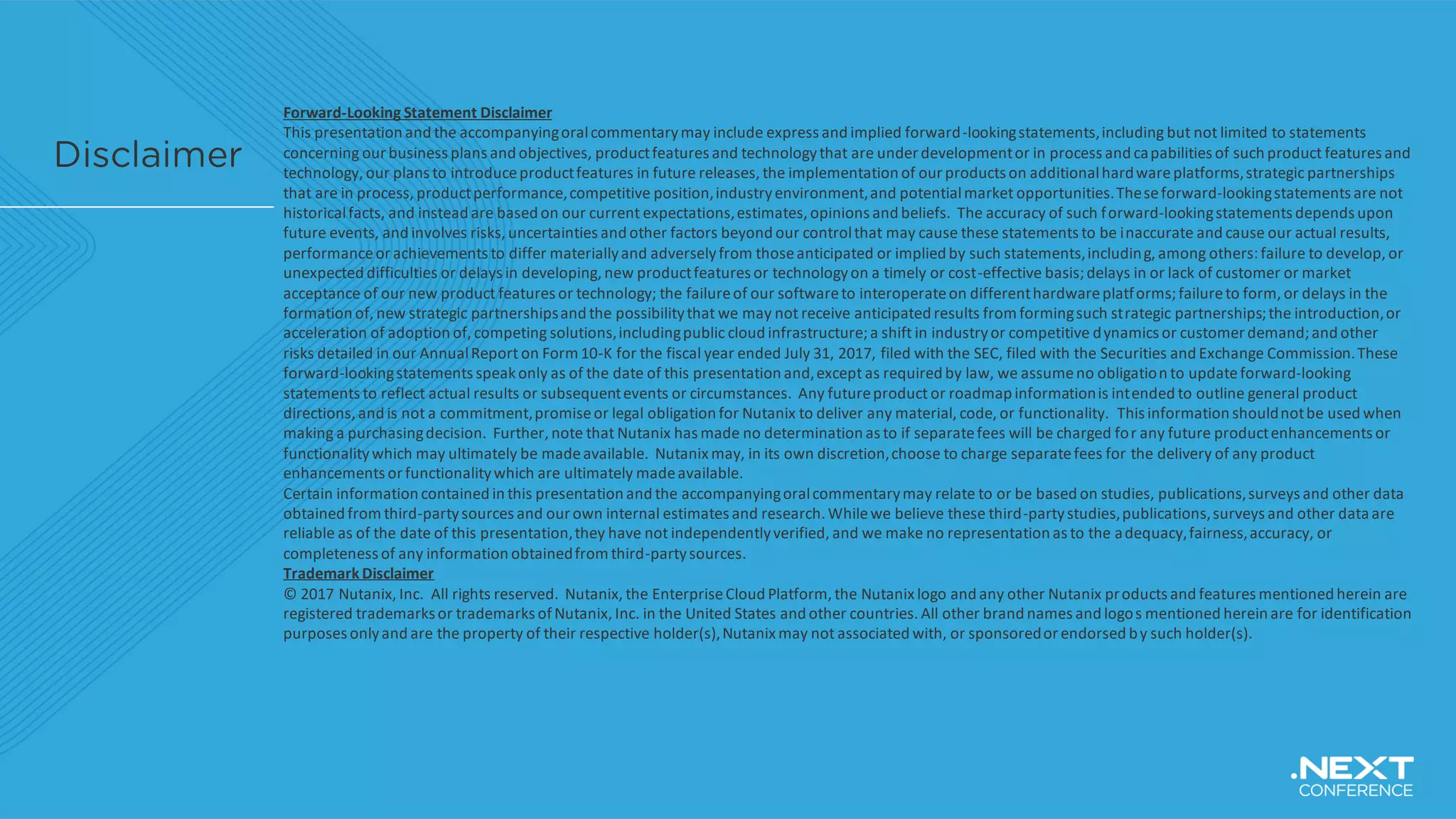 This document contains a forward-looking statement disclaimer from Nutanix regarding their business plans, product features, and technology developments. It emphasizes that these statements may involve risks and uncertainties that could lead to actual results differing from expectations. Additionally, it states that any future product information is not a promise or commitment, and also includes trademark disclaimers.
