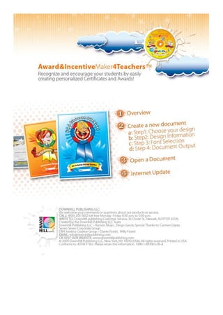The document describes the 'Award Maker 4 Teachers' software that allows educators to create personalized certificates and awards for students. It provides a step-by-step guide on how to create, save, and print documents, highlighting design selection, information entry, font choices, and document output options. Additionally, it mentions the availability of updates for new designs and outlines copyright and liability disclaimers.
