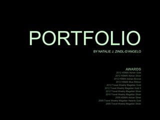 The document is a portfolio showcasing Natalie J. Zindl-D'Angelo's work in graphic design, including PowerPoint presentations, branding campaigns, and digital promotions. It highlights award-winning projects for clients such as American Express Vacations and various design samples available online. Contact information and links to additional portfolio pieces are also included.