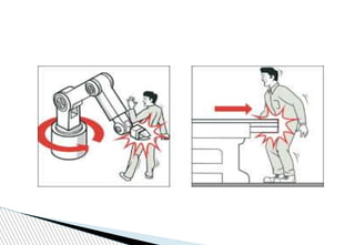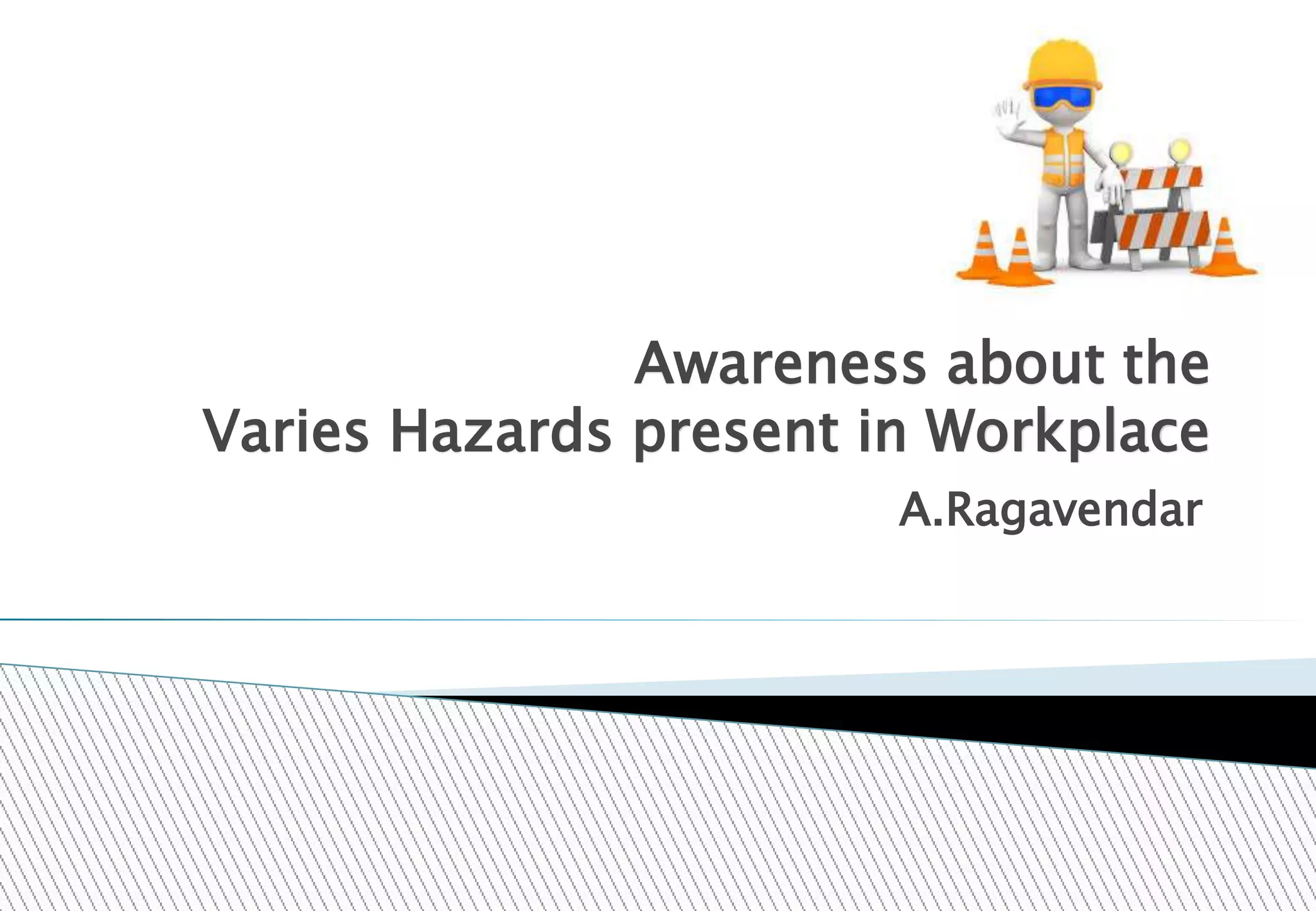 The document discusses various workplace hazards, emphasizing the importance of managing health and safety through moral, legal, and financial frameworks. It outlines common hazards including mechanical, physical, chemical, biological, environmental, and organizational risks, and highlights their potential impact on worker safety and health. Effective safety management strategies are proposed to recognize, control, and mitigate these hazards in order to reduce injuries and promote a healthier work environment.