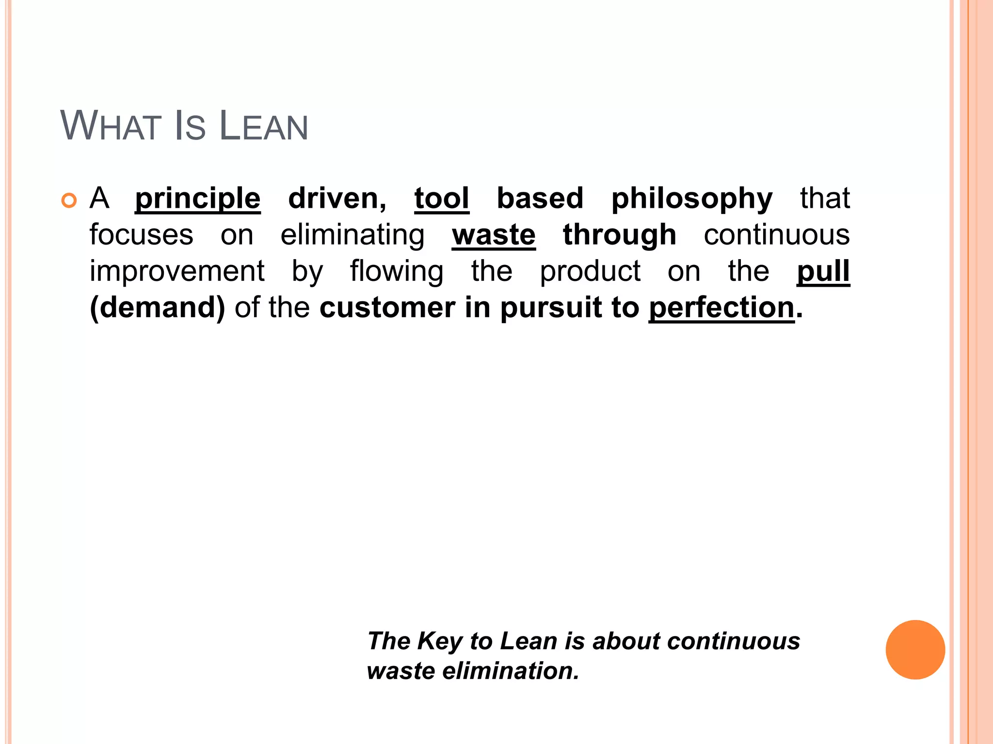 The document provides an overview of lean principles and quality control tools. It discusses lean as a philosophy focused on eliminating waste through continuous improvement. The key lean principles are specified as: specify value, identify the value stream and eliminate waste, make value flow, implement pull, and continuously improve. Quality control tools covered include check sheets, Pareto analysis, histograms, cause-and-effect diagrams, and brainstorming. 5S methodology and its five disciplines are also explained as a tool to maintain an efficient workplace.