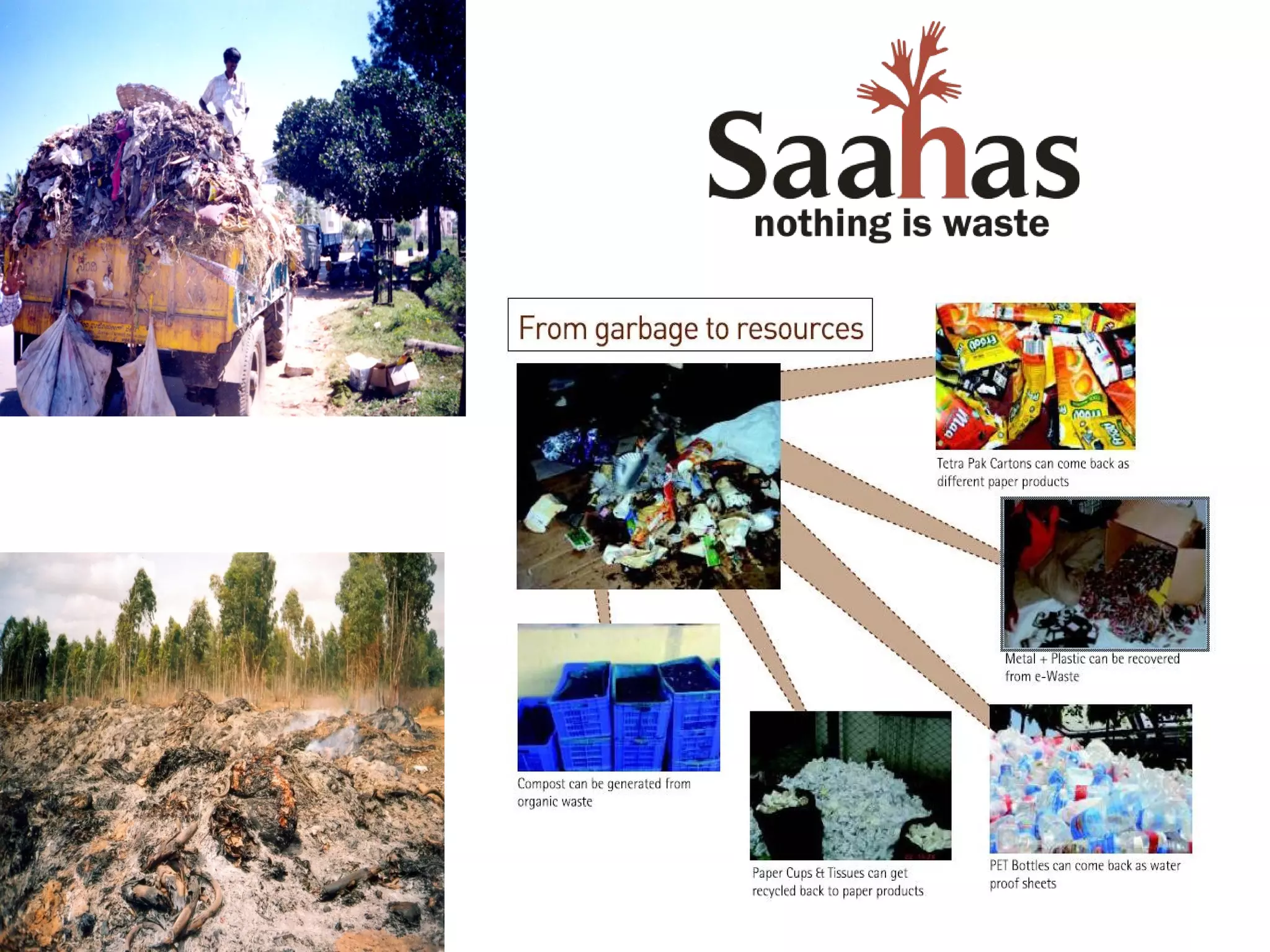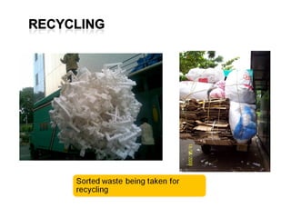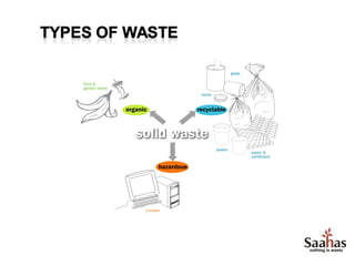 The document provides information about an organization called Saahas and its waste management programs and initiatives. It discusses Saahas' work in providing waste management services to collect 7,000 kgs of waste per day from clients. It also details their efforts to provide livelihood opportunities in waste collection and recycling. The document outlines some of their corporate and residential clients and waste segregation practices in schools. It promotes reducing plastic use and lists some recycled products.