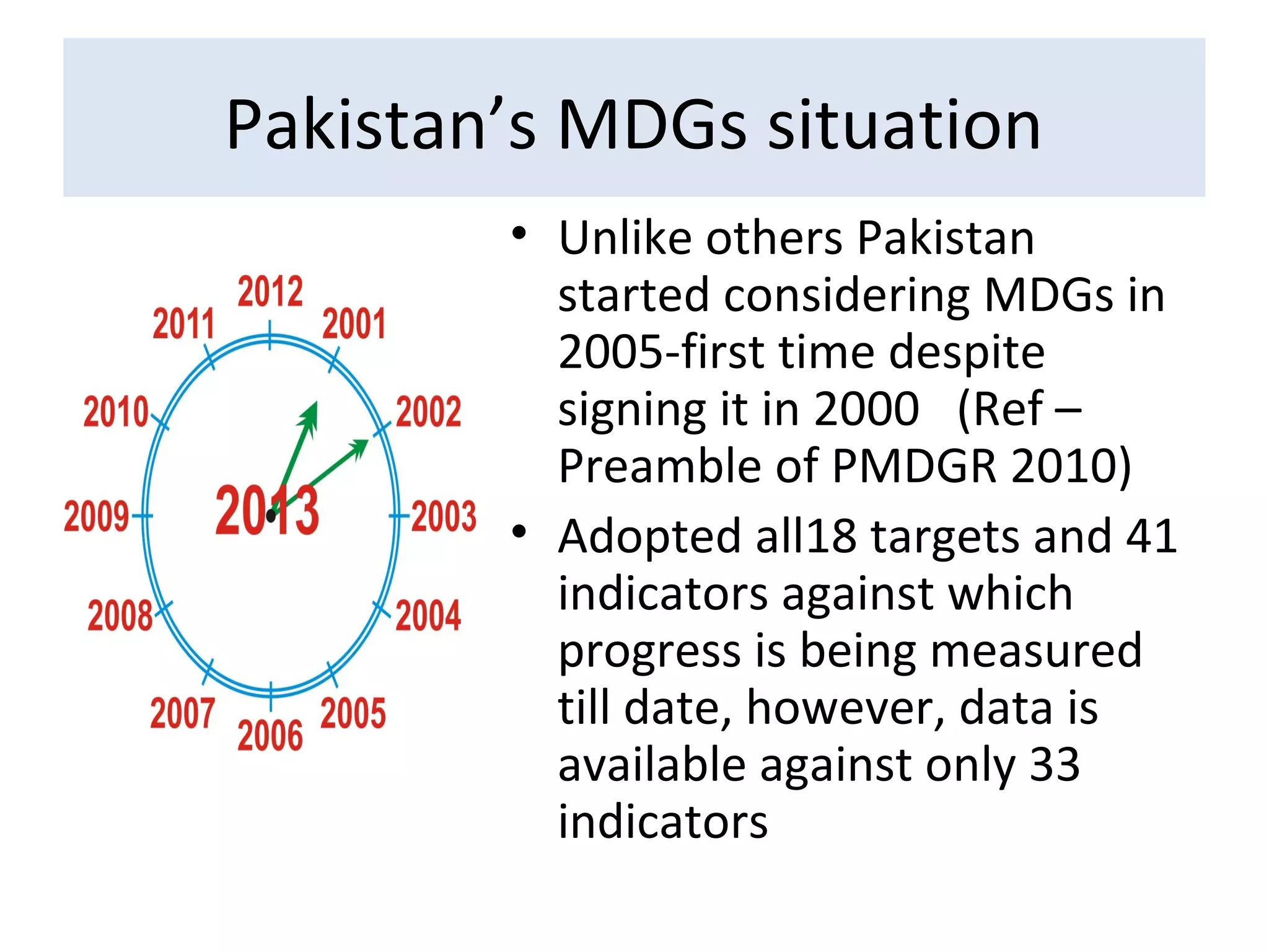 The document summarizes Pakistan's progress towards achieving the Millennium Development Goals (MDGs). It finds that Pakistan has made slow or no progress on most targets. Only MDG-6 around HIV/AIDS is on track, while MDG-2 on education and MDG-3 on gender equality have seen slow progress. MDG-1 on poverty, MDG-4 on child mortality, MDG-5 on maternal health, and MDG-7 on environmental sustainability are far behind targets. Pakistan also faces many challenges including a lack of reliable data, natural disasters, economic crises, and low prioritization of MDG spending. Consultations across Pakistan found that priorities for future development goals should include peace,