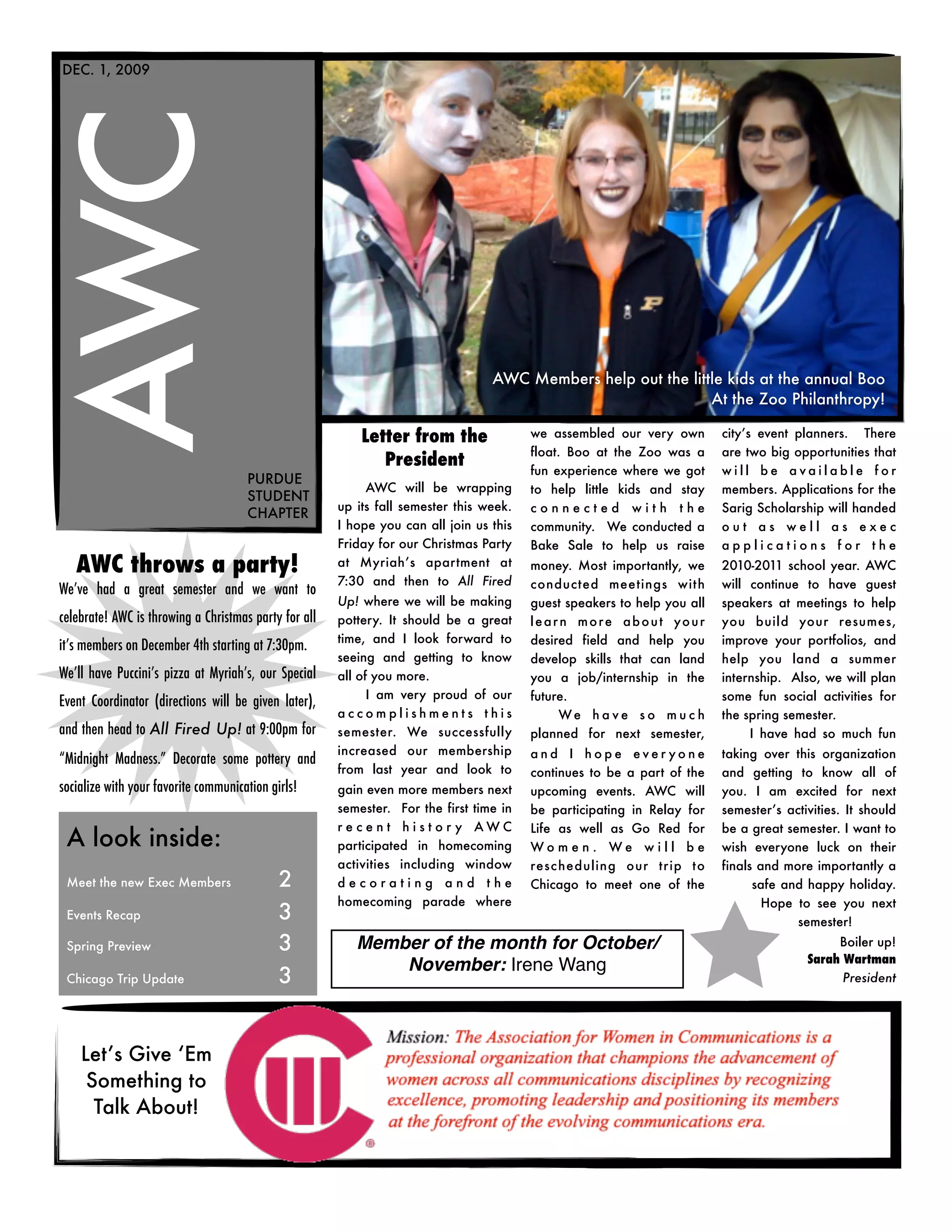 The AWC had a successful semester, participating in homecoming activities and Boo at the Zoo. They are looking forward to the spring semester which will include Relay for Life, Go Red for Women, and a rescheduled trip to Chicago. Applications will be available for scholarships and executive board positions. The AWC president is proud of their accomplishments and growth in membership. She looks forward to the upcoming semester and continued growth of the organization.