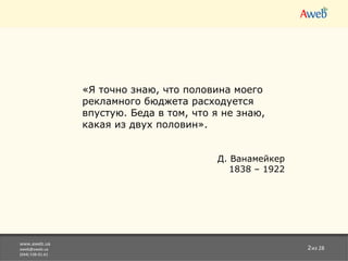 Документ обсуждает эффективное управление контекстной рекламой с акцентом на использование веб-аналитики для оптимизации рекламных кампаний. Он охватывает важные аспекты, такие как определение целей, настройка рекламы, сегментация ключевых слов и отслеживание конверсий. Рекомендуются методы анализа эффективности для повышения ROI и улучшения результатов рекламы.