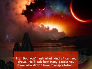The document lists 10 things that God will not ask about on judgment day, focusing more on how people treated others and lived with integrity and character rather than material possessions or achievements. It emphasizes that God will ask how people helped those in need, performed their duties, treated their neighbors, and lived with good character over what kind of car one drove, the size of one's house, job title or salary, or other superficial factors. The passage encourages sharing it with others considered "keepers" in one's life.