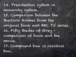Can't choose a compare and contrast essay topic? Essayshark.com has found 40 unique topics for your compare and contrast essay! Try any you want for FREE.