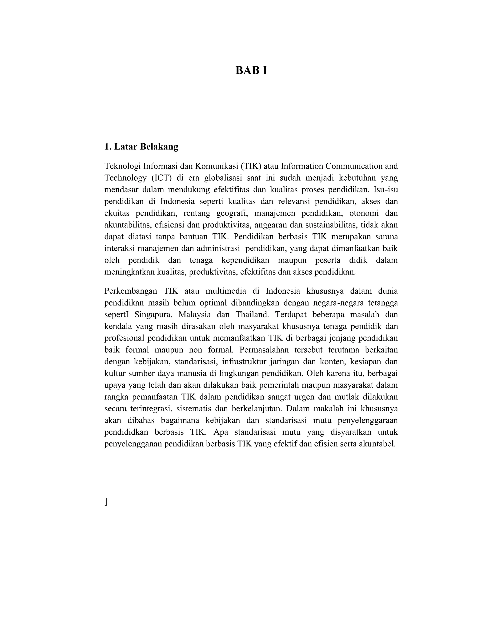 Dokumen ini membahas pentingnya teknologi informasi dan komunikasi (TIK) dalam meningkatkan kualitas pendidikan di Indonesia, serta tantangan yang dihadapi dalam pemanfaatannya. TIK diharapkan dapat mendukung akses, efektivitas, dan mutu pendidikan melalui berbagai model pembelajaran, termasuk pendekatan jarak jauh dan e-learning. Kebijakan dan standarisasi mutu diperlukan untuk memastikan implementasi TIK dalam pendidikan berjalan secara efektif dan efisien.