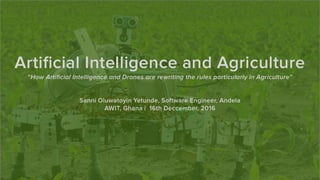 The document discusses the potential impact of artificial intelligence and drone technology on agriculture, highlighting their roles in improving efficiency and productivity amidst increasing global food demands. It mentions applications such as crop monitoring, soil analysis, and pest management, emphasizing the need for innovative solutions to tackle challenges like undernourishment in Africa. Despite advancements, it notes limitations such as financial constraints, regulatory hurdles, and the necessity for expertise in technology deployment.