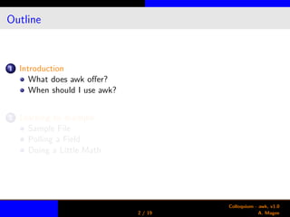 The document is a colloquium on using the awk text processing utility. It provides an introduction to awk, explaining that it is useful for parsing structured data files and making precise edits to files. The bulk of the document contains examples of awk commands operating on sample text files, demonstrating how to print fields, select lines, and perform basic math operations like summing columns. The examples illustrate awk's ability to select records, access fields, and execute commands at the start or end of processing a file.