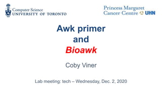 Bioawk is a tool that extends GNU awk to facilitate working with biological file formats like FASTA, FASTQ, SAM, BED, GFF, and VCF. It directly reads gzipped files and treats spanning sequences as single records. Some key functions added in Bioawk include calculating GC content, reversing/reverse complementing sequences, and working with quality values. Bioawk allows for convenient parsing, manipulation and statistical analysis of genomic data.
