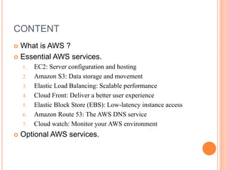 Amazon Web Services (AWS) is a leading provider in IaaS and PaaS for cloud computing, offering essential services like EC2 for server hosting, S3 for data storage, and Elastic Load Balancing for scalable performance. Key features include CloudFront for content delivery, Elastic Block Store (EBS) for low-latency storage, and Route 53 for DNS routing. AWS also provides monitoring through CloudWatch and optional services like Lambda and Elastic Beanstalk for enhanced cloud functionality.
