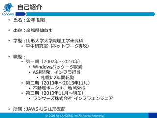 JAWS UG 山形で発表させて頂きました、ランサーズでのAWS活用事例です。 米沢で初めての開催で、母校の山形大学工学部で発表させていただきました。 AWS入門ということで、活用しているサービスを一通り紹介させていただきました。 大学の講義で出てくるテーマも一部織り交ぜています。