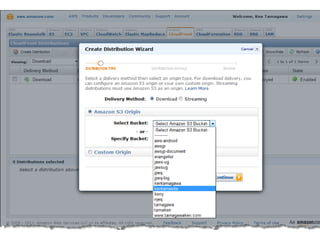 世界18か所に及ぶエッジロケーションから、高速配信 ルートオブジェクトを指定できる CNAME設定も可能 S3との密な連携(バケットを指定するだけ) S3以外にもオリジンを指定できる(EC2, オンプレミス、他)