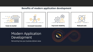 The document discusses the transformation of application architecture through microservices and serverless strategies to enhance agility and scalability in modern digital businesses. It outlines key technologies and concepts for implementing these architectures, such as event-driven systems, messaging services, and automation tools within AWS. Additionally, it emphasizes the importance of decoupling services and utilizing specialized data management strategies to support innovation and operational efficiency.