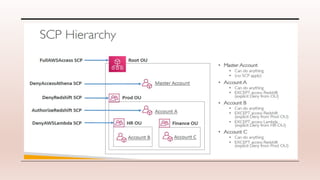 AWS Organizations is an account management service that consolidates multiple AWS accounts, allowing better governance through IAM policies and role-based access control. Key components include a master account, organizational units, and service control policies for managing security and access across accounts. The service supports consolidated billing and enables strategies for resource management, such as isolating accounts per department or for regulatory compliance.