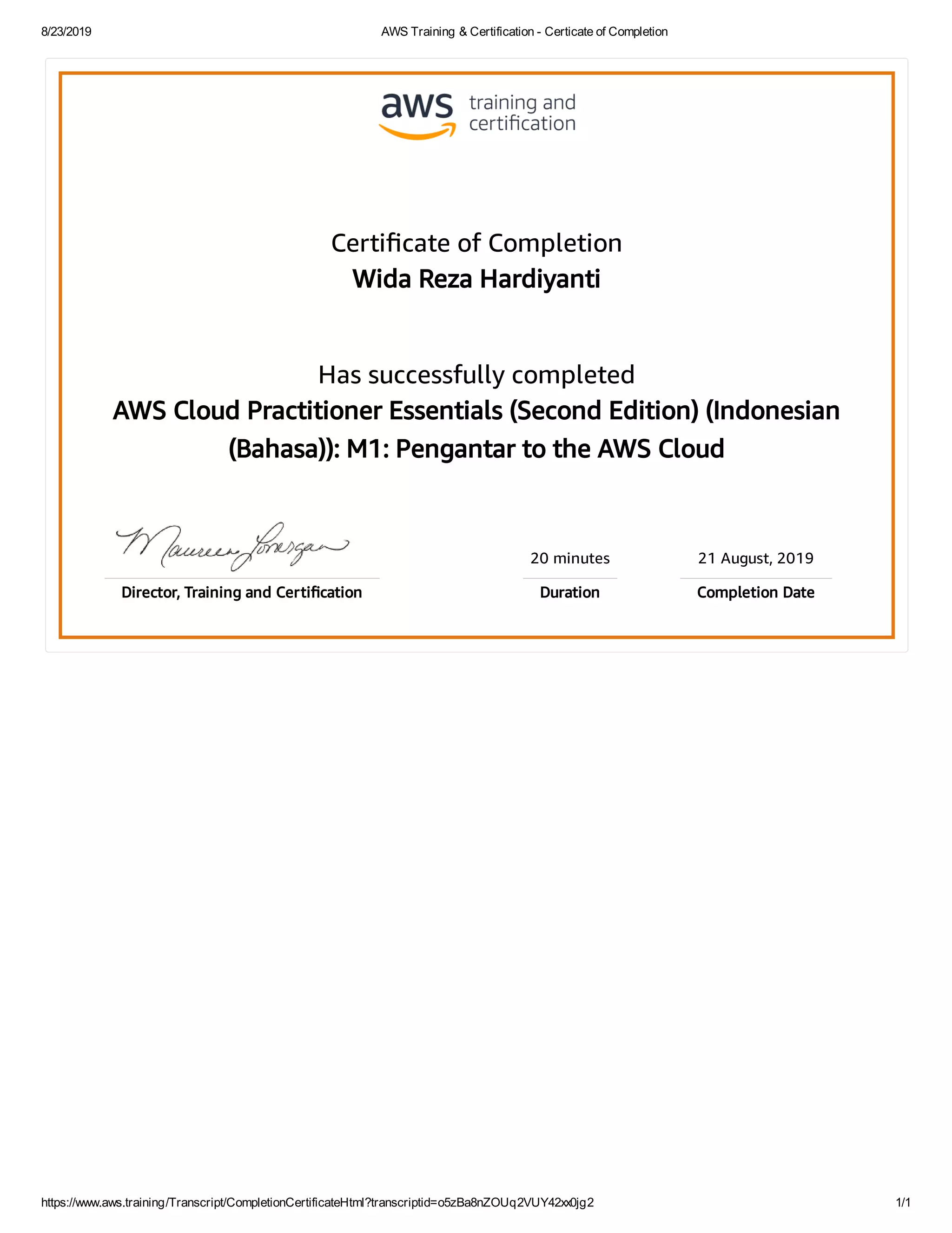 This certificate of completion recognizes that Wida Reza Hardiyanti successfully completed a 20-minute AWS Cloud Practitioner Essentials training course on August 21, 2019. The course, titled "M1: Pengantar to the AWS Cloud", is part of the AWS Cloud Practitioner Essentials (Second Edition) training in Indonesian.