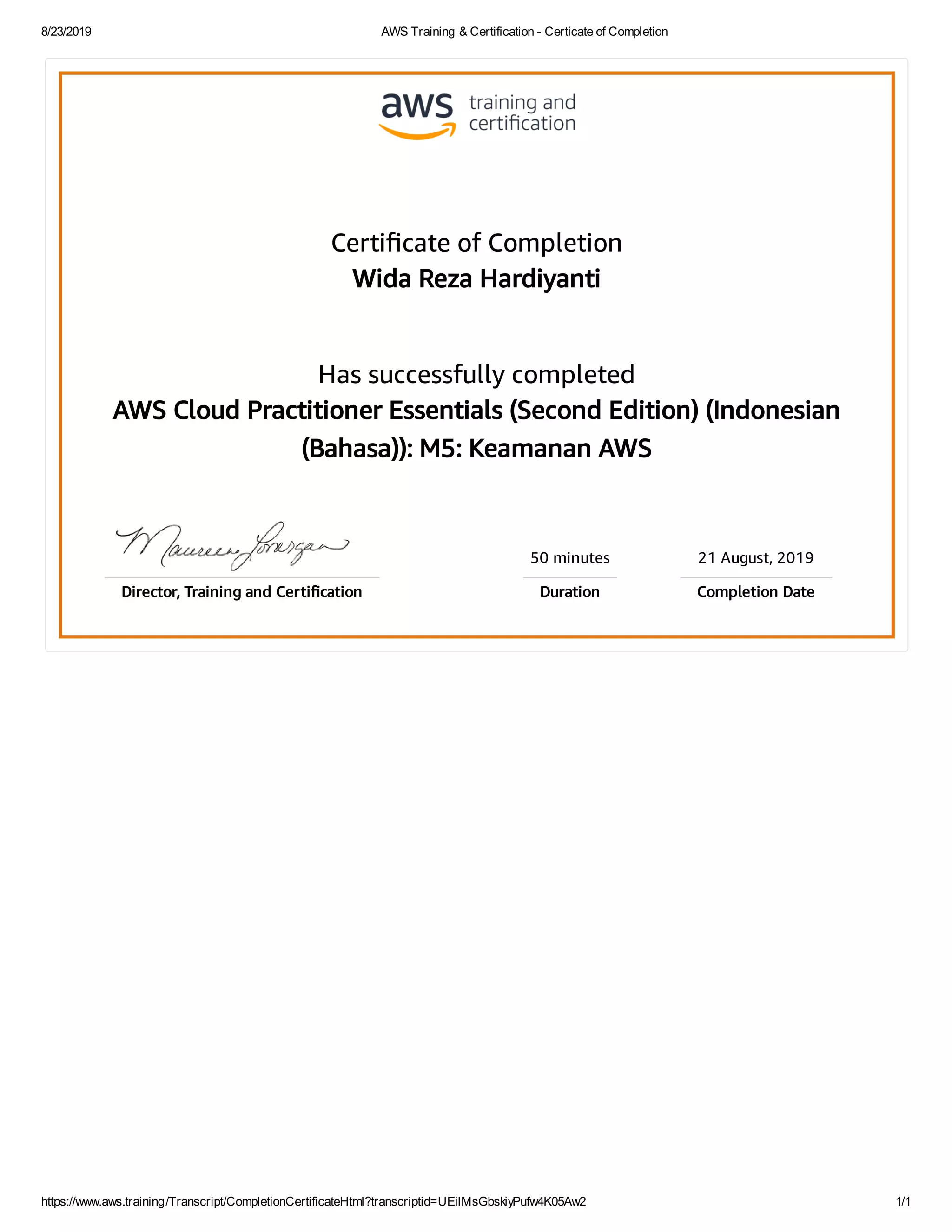 This certificate of completion recognizes that Wida Reza Hardiyanti successfully completed a 50-minute AWS Cloud Practitioner Essentials training course on August 21, 2019. The course was titled "M5: Keamanan AWS" and was conducted in Indonesian.