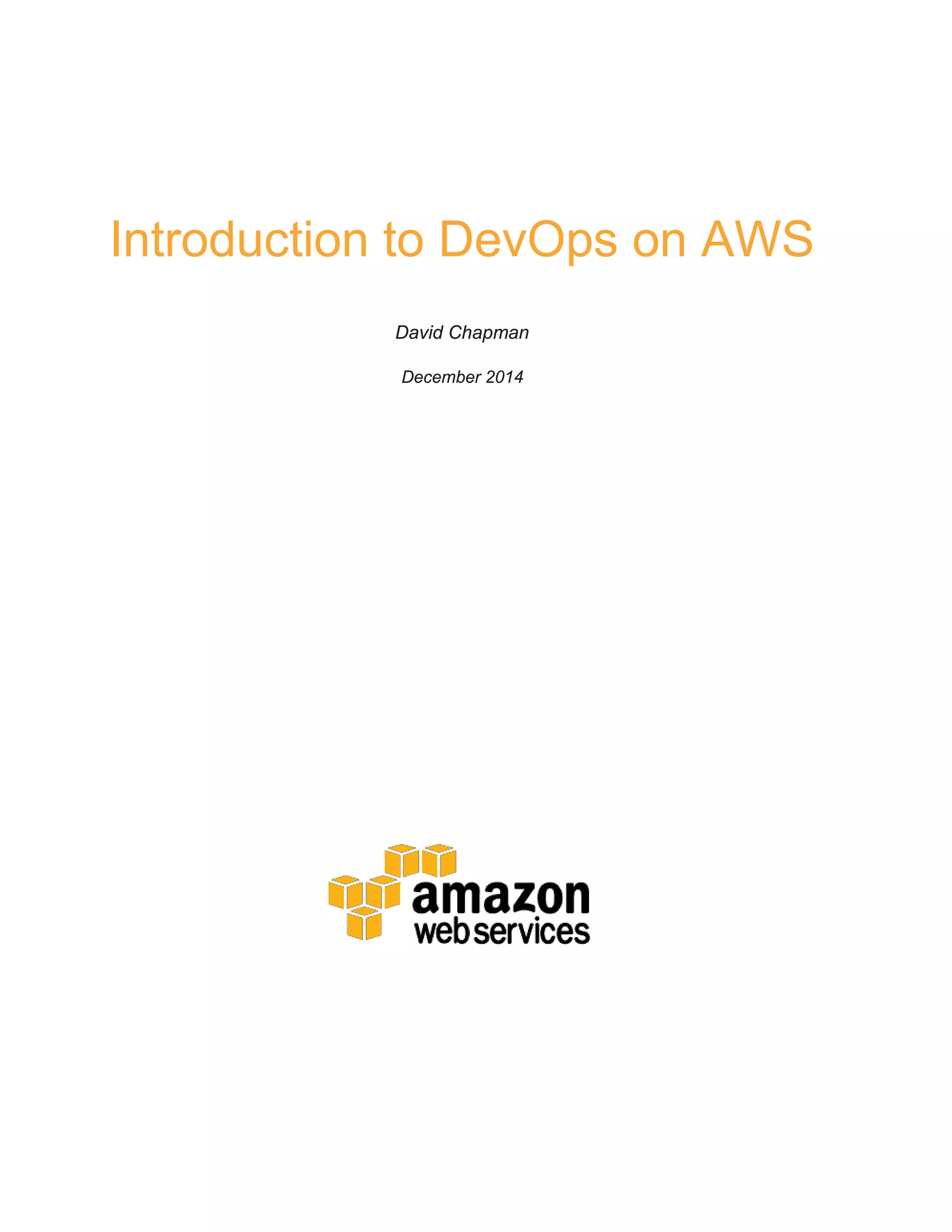 This document provides an introduction to DevOps principles and practices supported on the AWS platform. It discusses how DevOps has evolved from agile software development practices to focus on improved collaboration between development and operations teams. The core DevOps principles covered include infrastructure as code, continuous deployment, automation, monitoring, and security. AWS services that support these principles are also introduced, including AWS CloudFormation for defining infrastructure templates, AWS CodeDeploy and CodePipeline for continuous deployment, AWS CloudWatch for monitoring, and IAM for security.