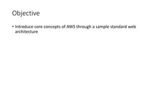 This document introduces core concepts of AWS through a sample standard web architecture. It discusses what AWS is, how and why Amazon launched it, and provides examples of key AWS services like VPC, EC2, EBS, ELB, and managed services. It also covers AWS architecture concepts like regions, availability zones, and infrastructure as code.
