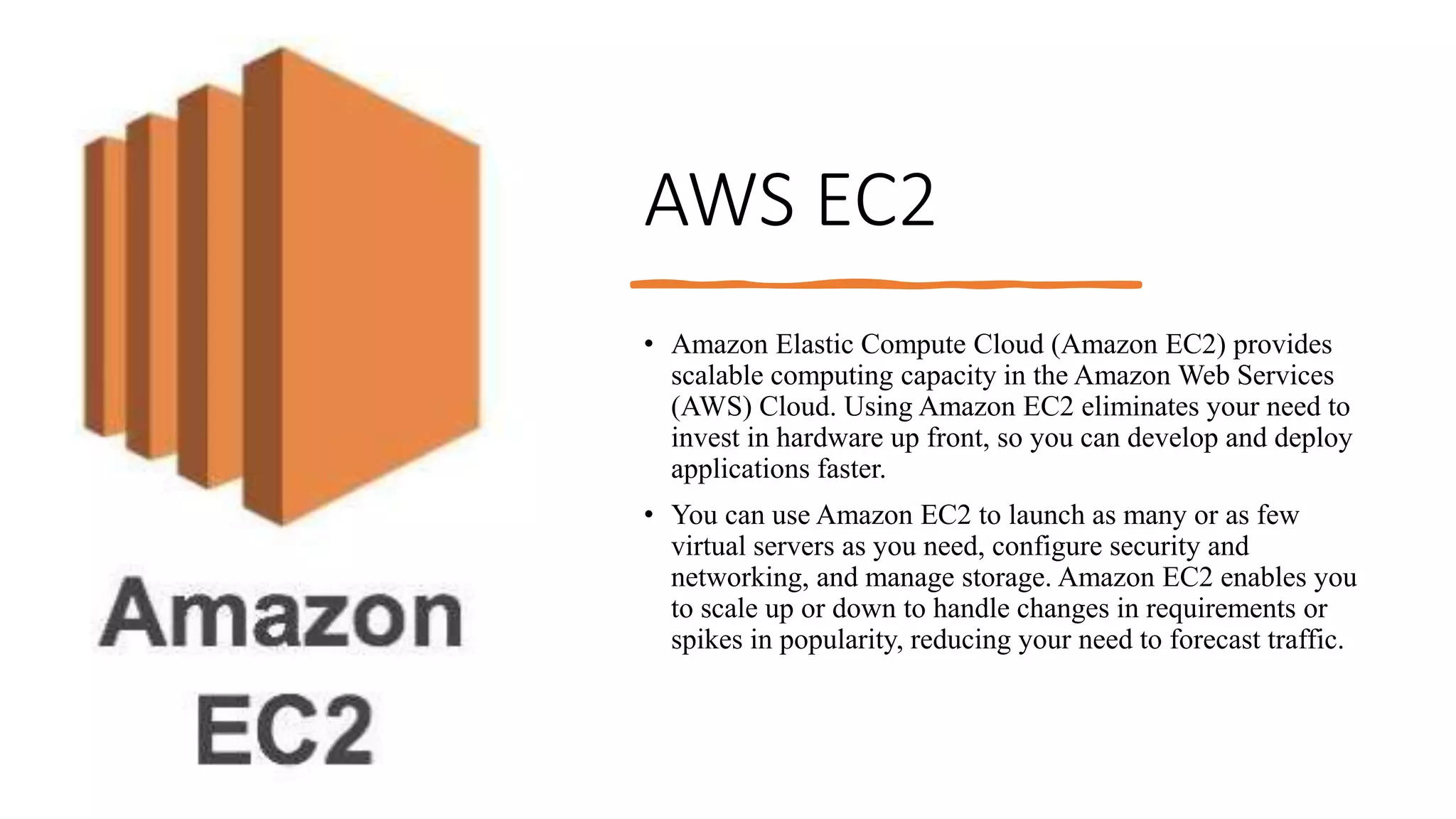 AWS EC2 provides scalable, on-demand computing capacity in the AWS cloud. It allows users to launch virtual servers as needed and configure security, networking, and storage. EC2 offers several instance types with varying CPU, memory, and storage configurations. Users can store data on instance storage volumes or EBS storage volumes. EC2 provides features like security groups, elastic IP addresses, tagging, and virtual private clouds to isolate and manage resources. Pricing options include on-demand instances, reserved instances for steady-state workloads which provide significant discounts, and scheduled reserved instances to match reservations to recurring schedules.