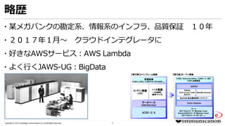 2017年11月1日に大手町FINOLABで開催された「Fin-JAWS 第1回勉強会」でのナレッジコミュニケーションの講演資料です。 『FintechをやったAWSインテグレータが語る AWSでの金融系システム構築・運用勘所』
