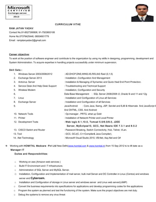 Ram Jatan Yadav has over 15 years of experience in software development and systems administration. He currently works as the Manager of IT at HOMITAL Medcare Pvt Ltd, where he oversees the IT environment and infrastructure, maintains various servers, and develops Android and web applications. Previously, he held roles as a software developer and systems administrator at Thetacom Telesolution Pvt Ltd and BAJAJ MOTORS Ltd, where he designed and programmed software systems, provided user support, and administered Windows servers and networks. Ram has extensive skills in areas such as Windows, Linux, databases, networking, and programming languages.