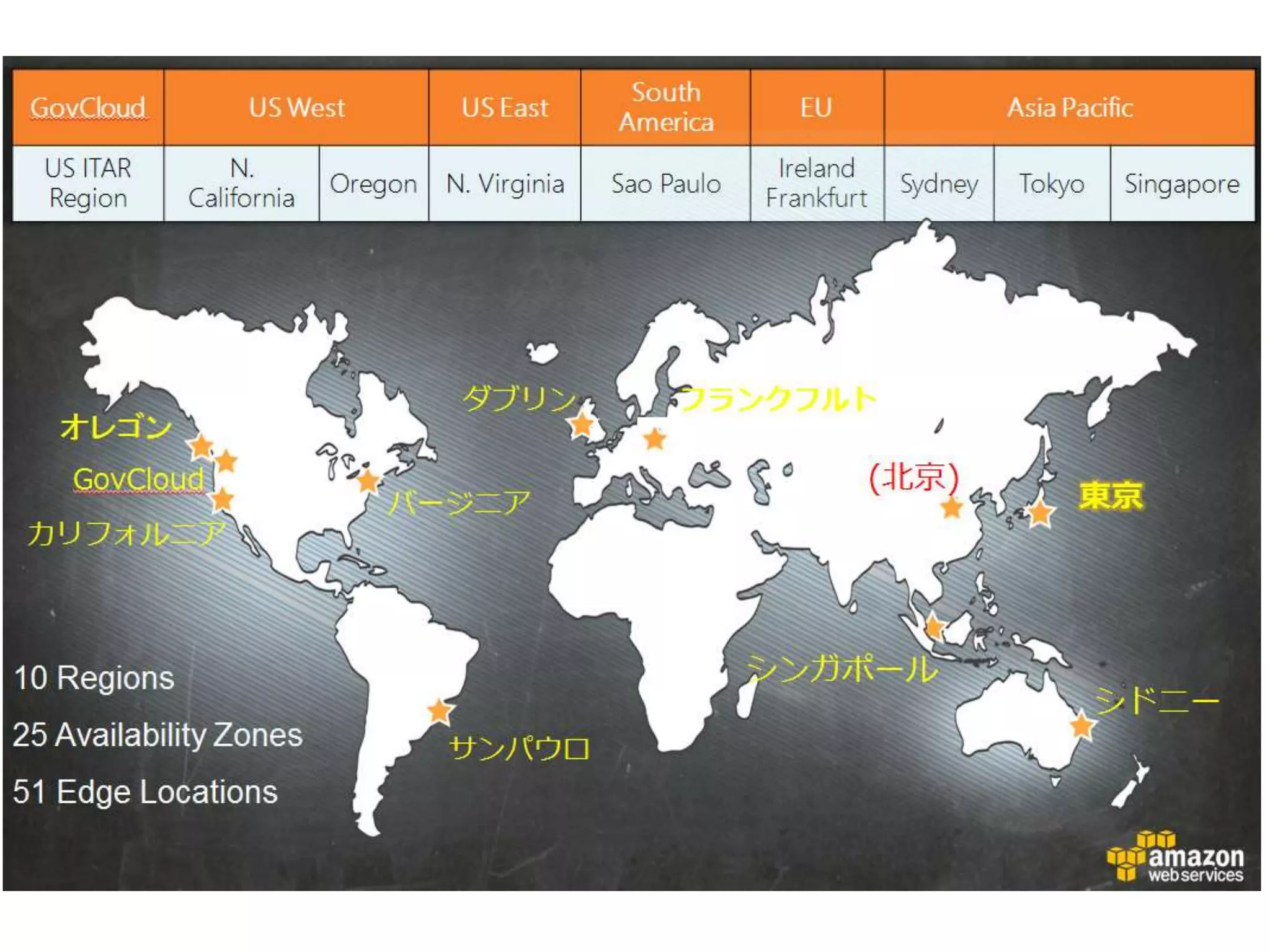 東京 オレゴン バージニア 北カリフォルニア サンパウロ シドニー アイルランド フランクフルト シンガポール こういうイメージ、 リージョン間をランダムにたらいまわすイメージ